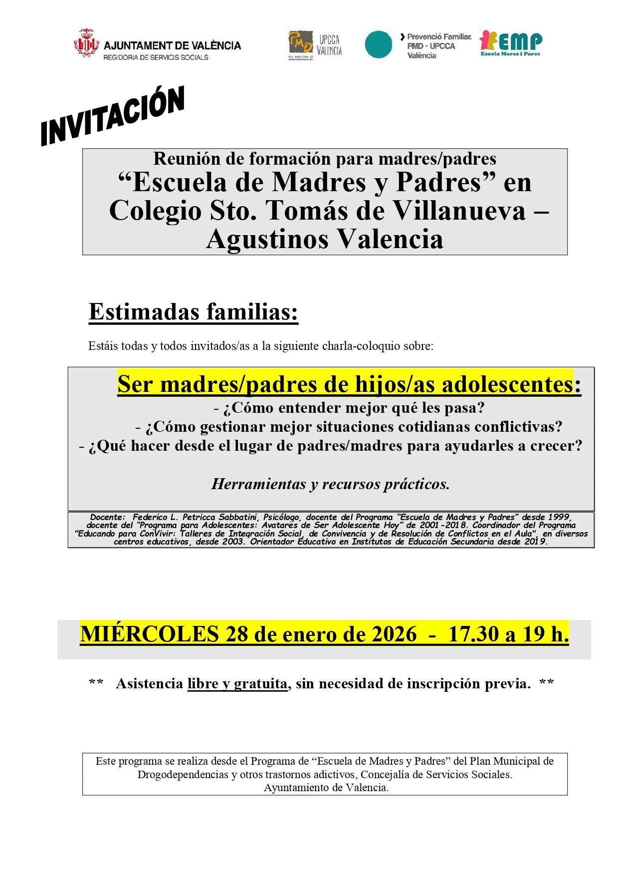 Dos cursos de formación: uno dirigido a la etapa de 6 a 12 años y otro para la de 12 a 18 años, que versarán sobre temas tan interesantes como roles maternos y paternos, etapa evolutiva y comunicación efectiva, normas …